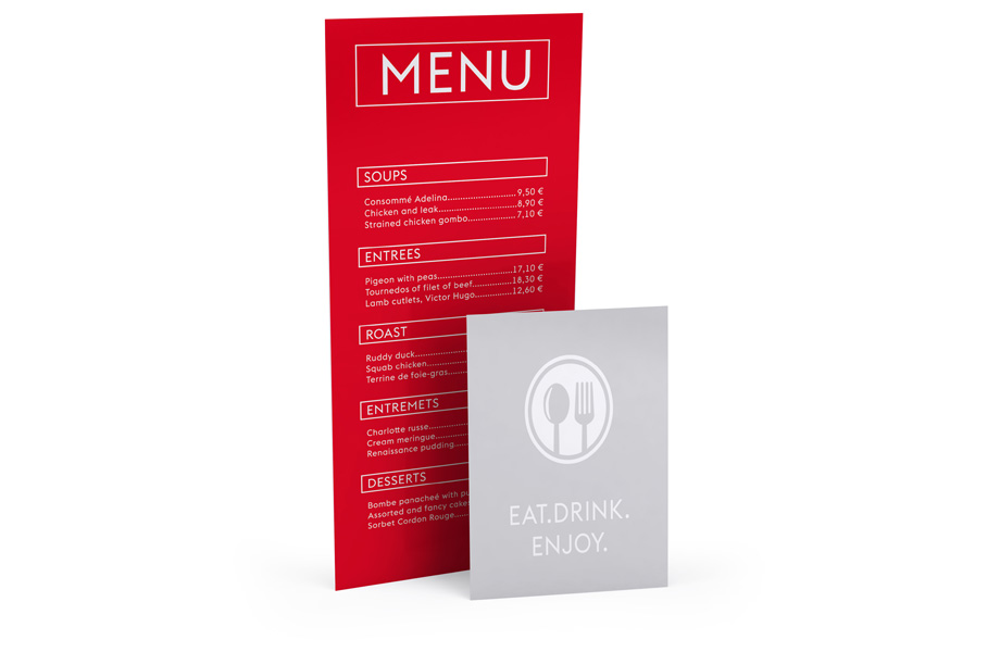 Wählen Sie für Ihre Speise- und Getränkekarten zwischen verschiedenen Formaten und seien Sie kreativ: Eine Karte im DIN-Format als Speisekarte, die Getränkekarte in Form eines Rechtecks und für besondere Angebote können Sie ein quadratisches Menü reichen. Durch diese unterschiedlichen Formate hat Ihr Serviceteam prompt die gewünschte Karte parat und Ihre Gäste behalten einen guten Überblick über Ihr vielseitiges Angebot.